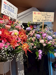 こんばんは〜! かほです☺️ テラスが1周年ということで10日(金)と11日(土)で周年イベントやってます✨ 天気悪いけどよかったら遊びに来てください❣️ 待ってます🥺🥺🥺 外にたくさん花束あってびっくりした〜!!